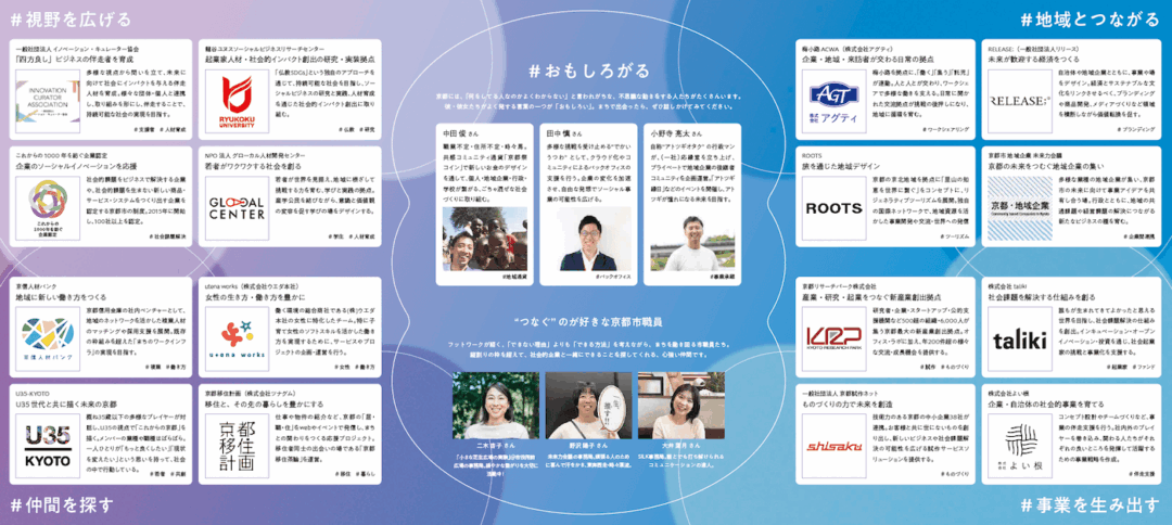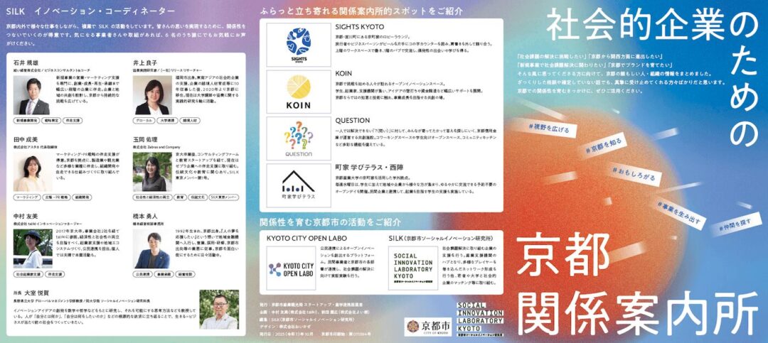2025.10.02 『社会的企業のための京都関係案内所』パンフレットをつくりました! 「社会課題の解決に挑戦したい」「京都から関西方面に進出したい」「新規事業で社会課題解決に関わりたい」「京都でブランドを育てたい」そんな風に思ってくださる方に向けて、5つのハッシュタグで京都の頼もしい人・組織の情報をまとめました。 #視野を広げる #地域とつながる #事業を生み出す #仲間を探す #おもしろがる ざっくりした相談や確定していない話でも、真摯に受け止めてくれる方々ばかりだと思います。京都での関係性を育むきっかけに、ぜひご活用ください。 ↓pdfが開きます ↑pdfが開きます prev all この記事を読んだ人におすすめ SILK SOCIAL INNOVATION Meets up OSAKA ~推し企業への愛を語り尽くす夜~ を開催しました! 2025.10.01 これからの1000年を紡ぐ企業認定 2025年度、第一回「これからの1000年を紡ぐ企業認定」制度説明会を開催しました! 2025.08.23 これからの1000年を紡ぐ企業認定 認定企業2社とSILKが語る「これからの1000年を紡ぐ企業認定」の現在地 — 自分たちで運営するコミュニティづくりへ — 2025.07.22