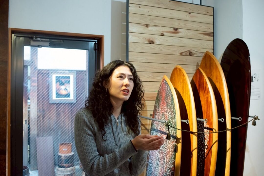 「私たちは樹液だけを使うのではなく、木全体を活用することが環境への取り組みの1つだと考えています。だから、漆の器だけでなく、サーフボードを作ったり、木くずでTシャツを染めたりもしています。」