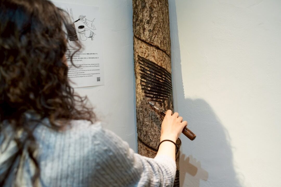 「漆を採取するときに、漆の木をいきなり傷つけるとびっくりしてしまうんです。だから最初は小さな傷を入れて、4日後に少し大きくして、さらに4日後にまた大きくしていきます。そうやって、少しずつ対話をしながら樹液を取るんです。」