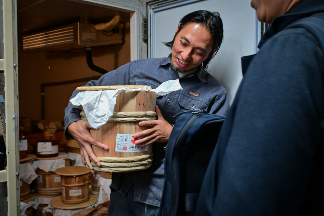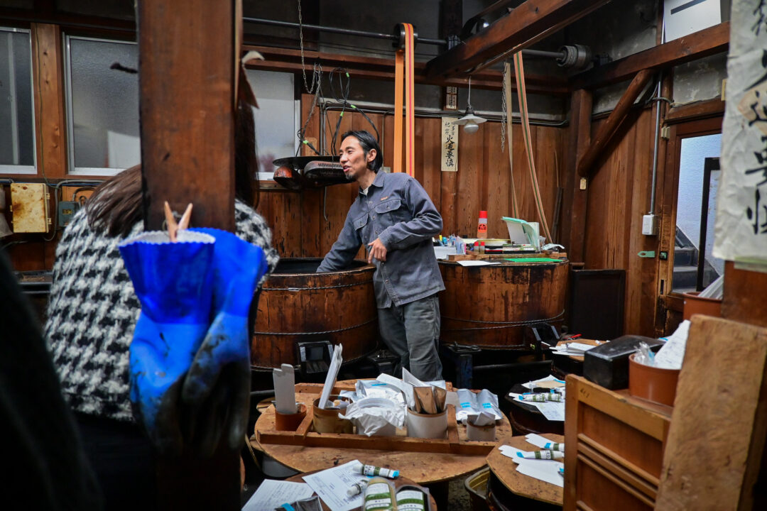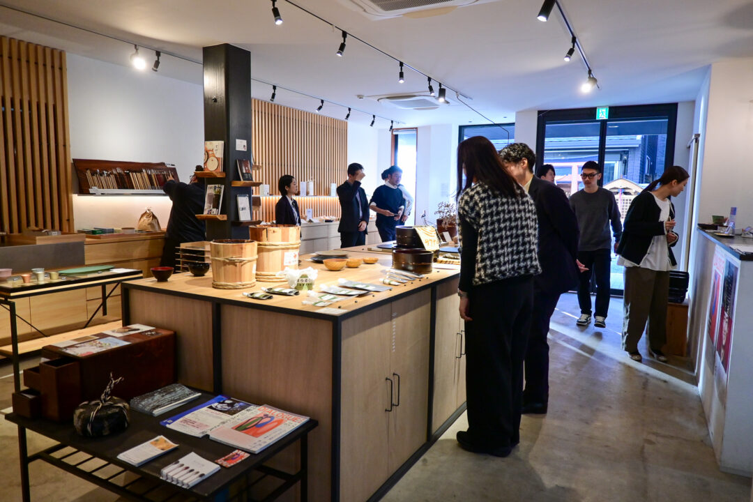 意見交換を始める前に、まずは皆で会社見学をすることに。四代目の堤 卓也さんが、漆の精製や調合を行う工房と2024年にオープンしたショップを案内してくださいました。